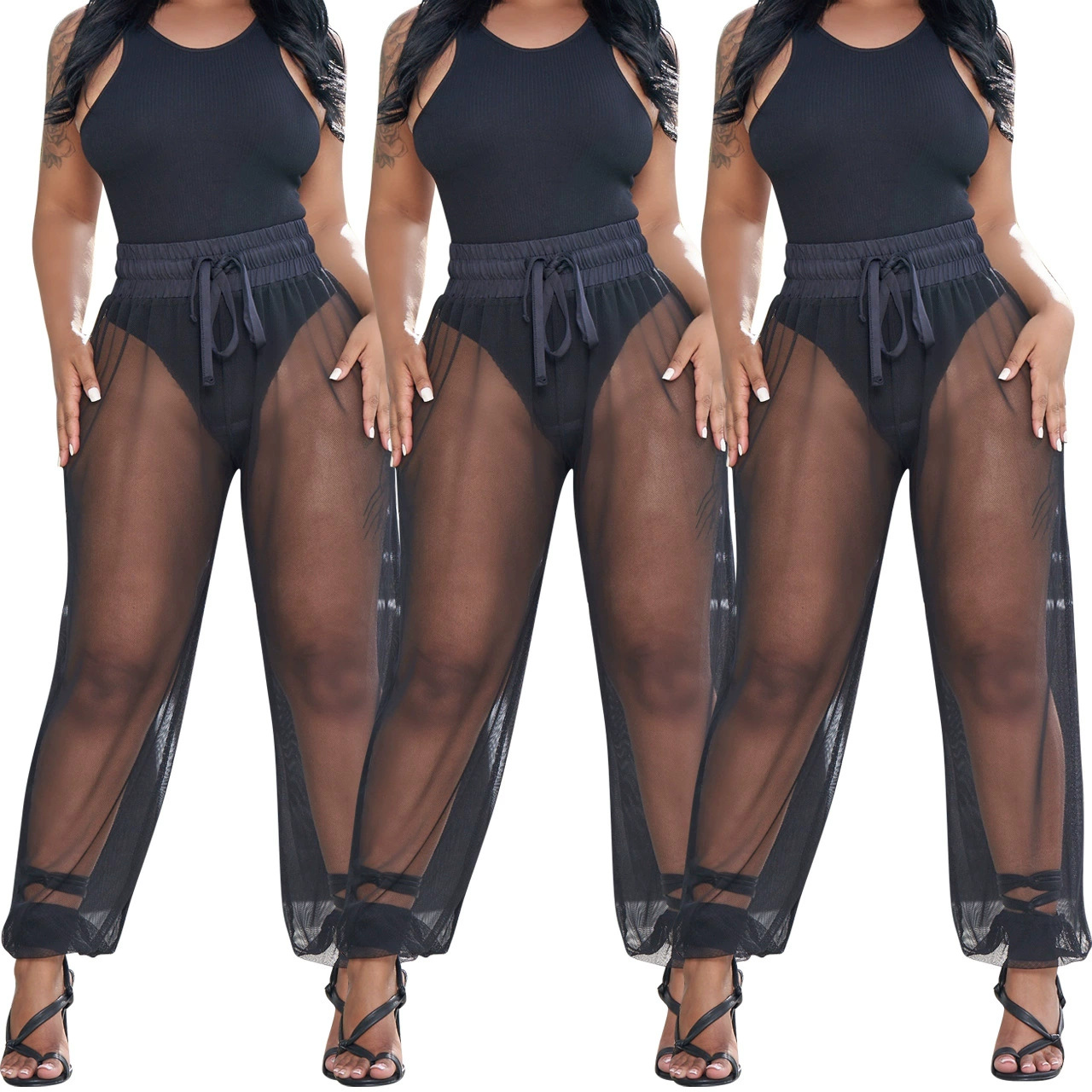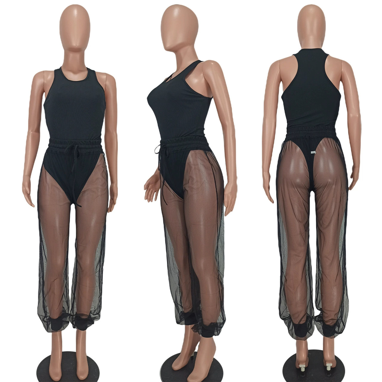 Hole-ribbed Tank Top And Mesh Pants Two-piece Set